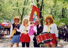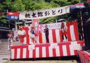 平成12年5月5日子供の日に合わせて,愛知県犬山市の桃太郎神社で,桃太郎まつりがあり、素人ちんどんが,愛知,静岡,富山から5組集まり,大いにまつりを盛り上げました。境内周辺には売店が10店余りあり、各店から多大なご祝儀をいただきました。