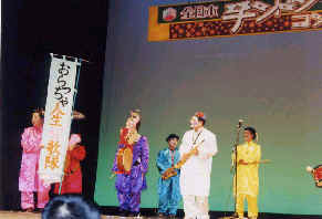 口上「ターツアイニイハオ、ニイハオマ、私たちは,只今上海から帰ってまいりました、おらっちゃ人生桜歌隊です。今,富山県では,県下挙げて,富山〜上海便就航に向けての大運動を展開しています。私たちも応援します。それでは会場の皆さん,ご一緒にご唱和願います。「早期実現、富山上海便就航」シェシェ」でした。
