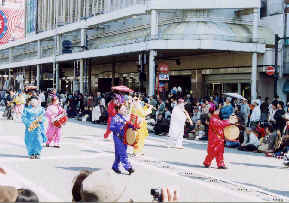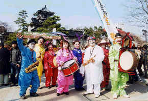 終着点の富山城址公園に到着しても、観客のアンコールで、またまた演奏しました。市民の皆さんは、こよなくちんどんを愛しておられるのです。(多少の下手さも受け入れておられます。)