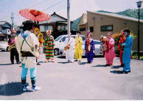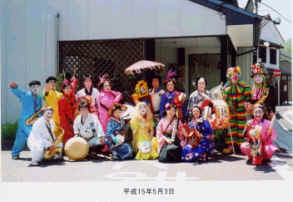 平成15年5月富山を早朝5時に出発し、上高地から松本へ抜け,中央道を駆け抜け,ついた時間が10時やって来ました愛知県香嵐渓。早速化粧や着替えを済ませ,記念写真に収まりました。白いチャイナ服で町を散策していると、この時期話題になった,白装束集団の一味と疑われました。富山から来たちんどんマンと判り一安心。足助町のご町内を流しめざすは,紅葉で有名な香嵐渓へ。ゴールデンウィークとあって人の多いこと。