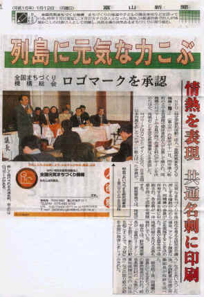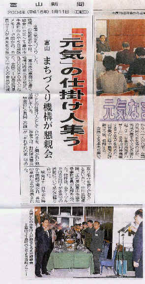 平成16年1月10,11日富山市の駅北にある自遊館で全国元気まつづくり機構の総会が開催されました.我が、「おらっちゃ人生桜歌隊」も会員として参加しました.この機構は,全国をネットワークに,各地で地域の活性化を仕掛けていこうということで、’03年3月に発足し,9月にNPO法人に認定されました。ちなみに内閣府認定番号は1260号。その記念すべき第1回の総会です。