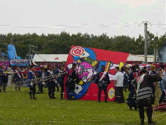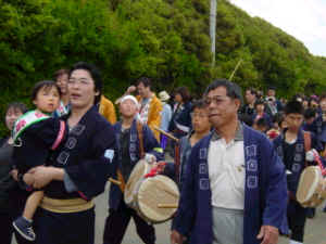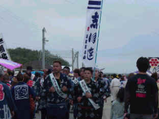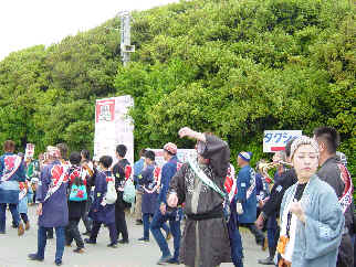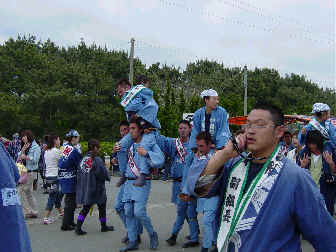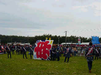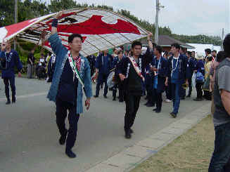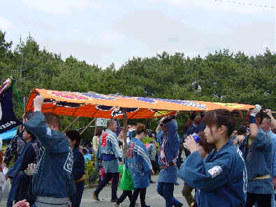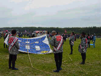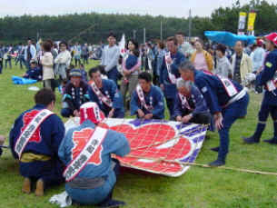 昼は、凧揚げ会場が舞台です.町内ごとや、会社、グループごとにチームを編成し、その数なんと170組揃いの法被姿がりりしく、老いも若きも老若男女一緒になって凧揚げに打ち込む姿がたまりません.会場は、町並みから離れているので、町内はきっと空っぽ状態でしょう。各チーム毎にテントブースを設営し、1日がかりで凧揚げをしているとか。