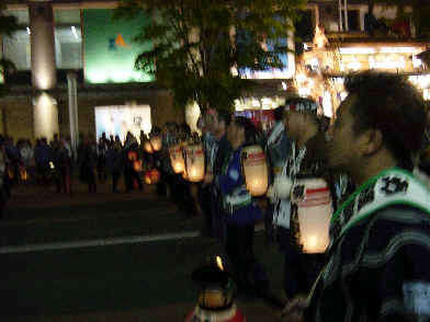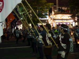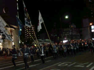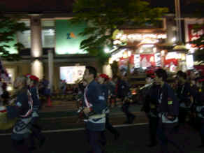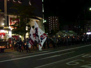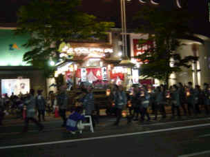 夜は、屋台が登場します.そして屋台のお囃子とは別に、先ほどの勇猛な法被姿の集団が、喇叭太鼓の音頭で、はやしながら、行列を組んで進んでいきます.これも圧巻です。