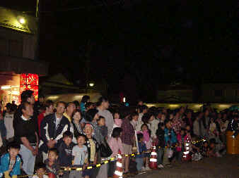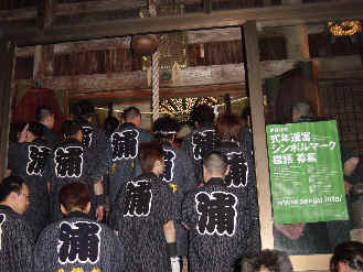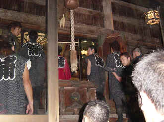 大行灯の出発前に、皆で気勢を上げ、団結ムードを盛り上げています.また、地元の神社で今年の豊作と祭りの無事故を祈願します。