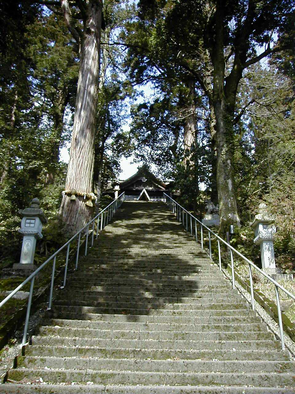 石段の下より上を仰ぐと社殿の入母屋造りが僅かに拝せられ、石段の両側には、老杉や大きな樫の木が立ち並び、苔むした樹根が大地を這うように広がっており、荘厳さを感じられます。
