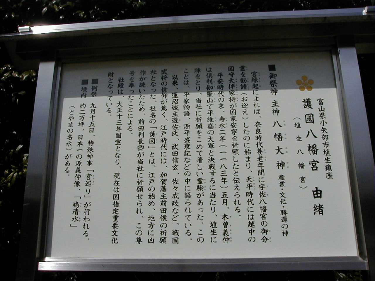 宮めぐりの神事 埴生護国八幡宮では、毎年9月第2日曜日に「宮めぐりの神事」が武者装束の氏子によって古式ゆかしく行われる。この神事は、砺波山源平合戦の折、源義仲が同八幡宮に戦勝祈願し、大勝したお礼参りの様子を見習って江戸時代から行われている。