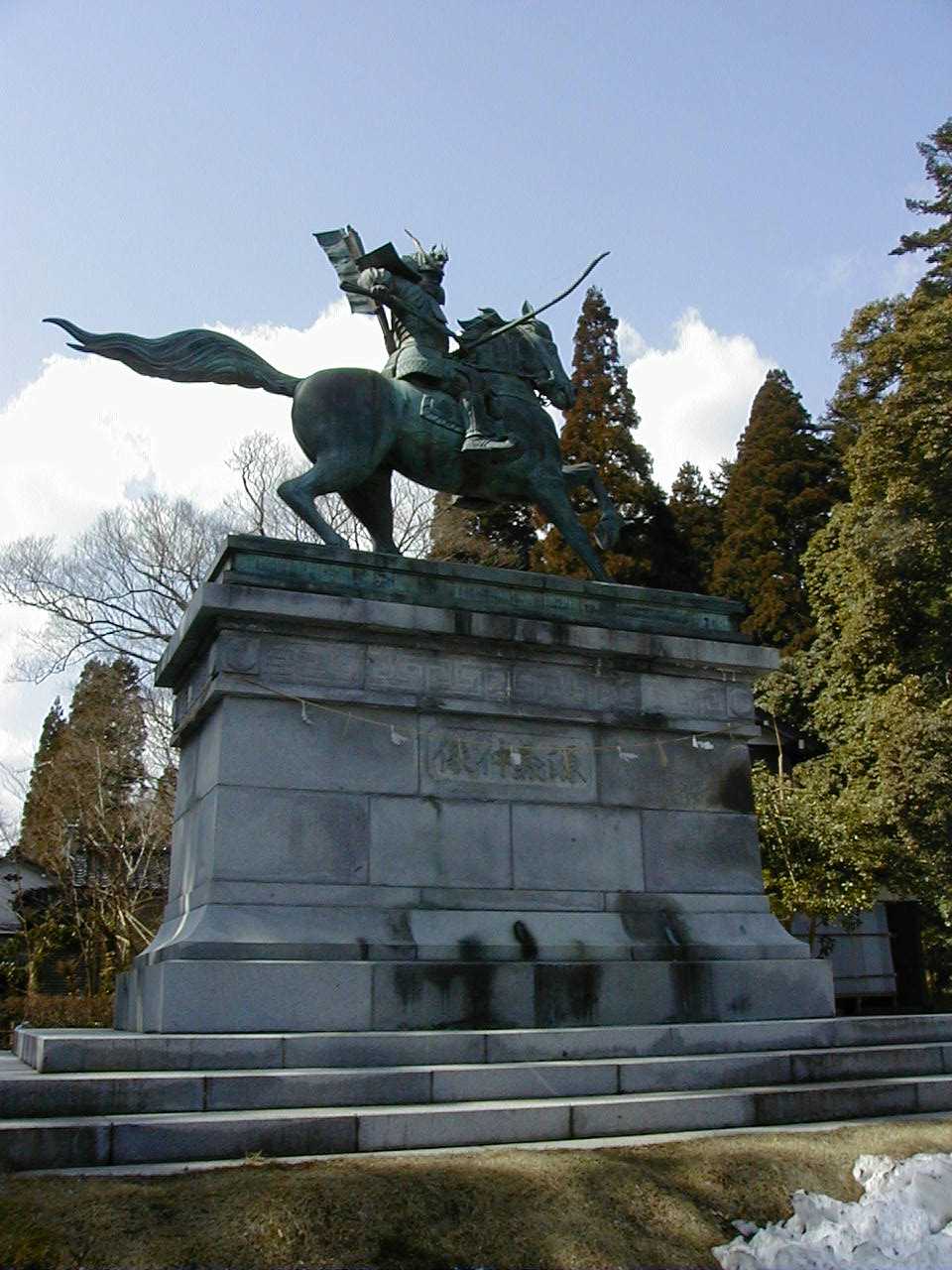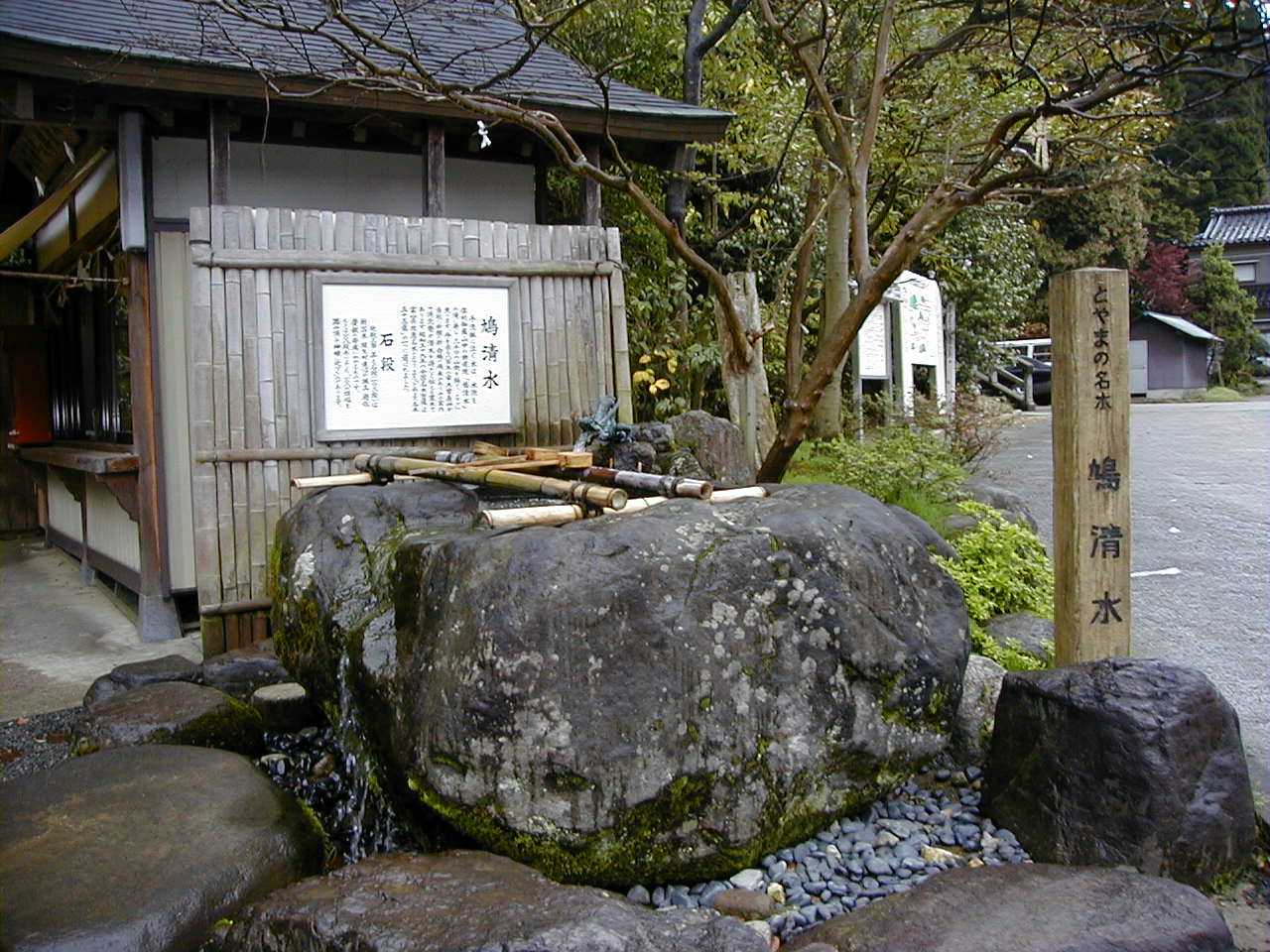 社務所前には、源平倶利伽羅合戦800年祭記念事業の一環として源義仲騎馬像と、源氏軍が鳩の案内で得たと言われている「鳩清水」の滝を水源としている清水が流れている。