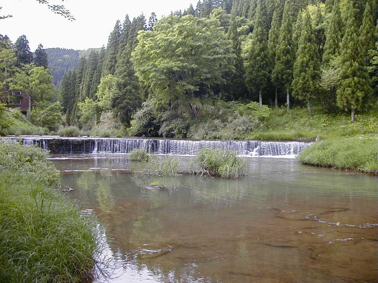 小矢部市の北部の山々を縫って、稲葉山の眼下を流れる子撫川。その清流に沿った谷間を宮島峡という。市街地から子撫川に沿って行くとやがて道は左右にくねり始める。両側の緑の山々が迫ってくる。六月は深緑が一段と目にしみる。