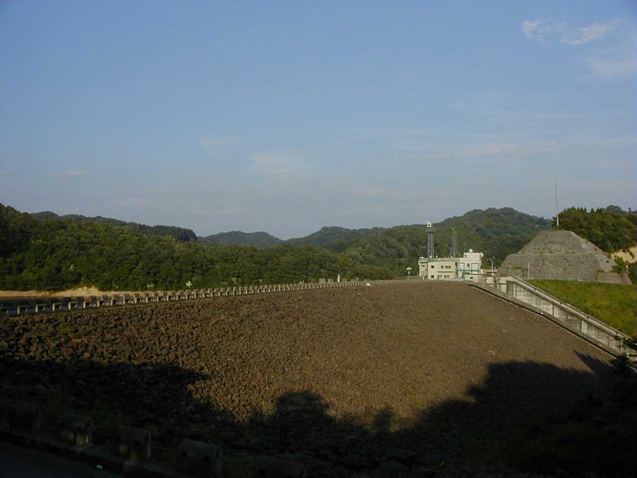 曲がりくねった道を辿っていくと、ロックフィールド工法で造られた雄大な子撫川ダムに到着する。