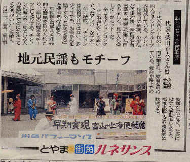 平成13年になり、何か鳴り物楽器があったほうが良いということで、杉さんと柴ちゃんがサックスを始めました。なかなかメロディが上手く鳴らせなかったので、テープカセットスピーカを購入し,テープも使いました.しかし,ちんどんはやはり生演奏が良いと言う事で,杉さんと柴ちゃんは,呉羽の富山市民芸術創造センターに通い,練習の日々でした。この年,明けみん母さんの知り合いで,マキさんが加わりました。