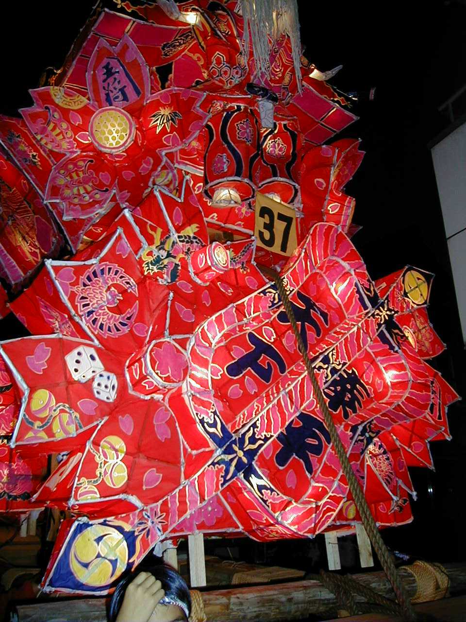 ・・・若衆の掛け声と笛、太鼓の囃子とともに二台の行燈が近づいていく。互いの行燈が一定の距離をとる。時がきた。緊張が若衆に走る。 裁許長の会図と同時に二台の行燈が互いをめがけて加速する。前方の担ぎ手たちが体を翻した瞬間、行燈がにぶい音とともに激しく激突する。