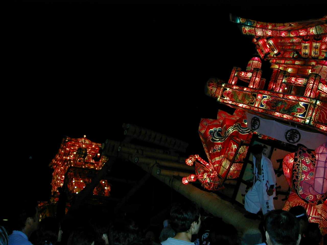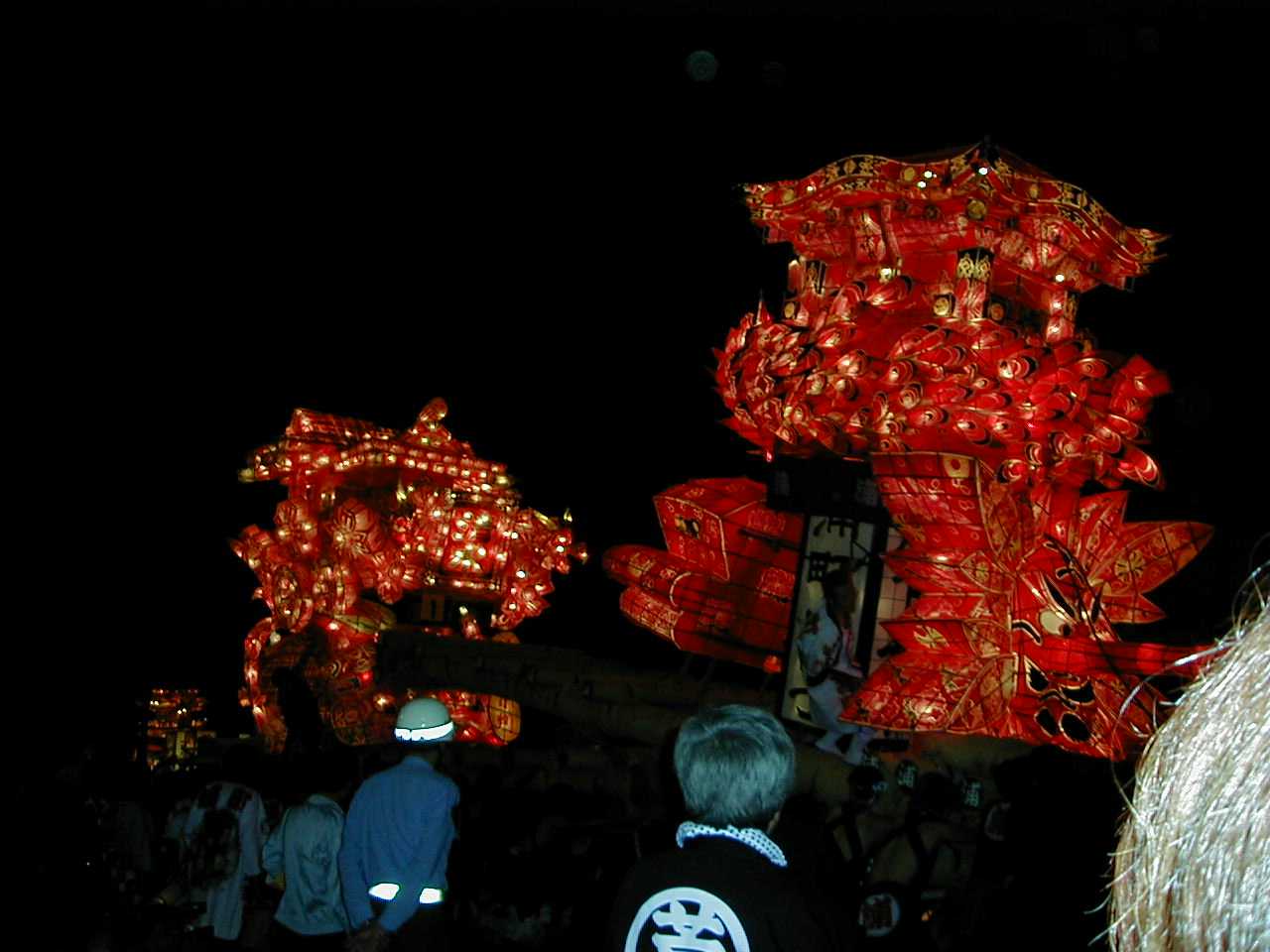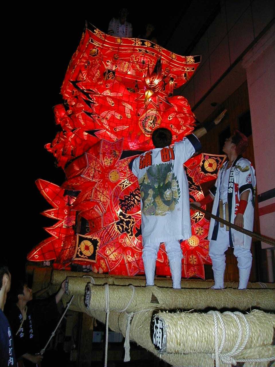 「」 怒号とどよめきの中、真剣な若衆の顔が行燈の灯かりに映し出される。祭りはこの瞬間、観衆も巻き込んで陶酔の頂点に達した。