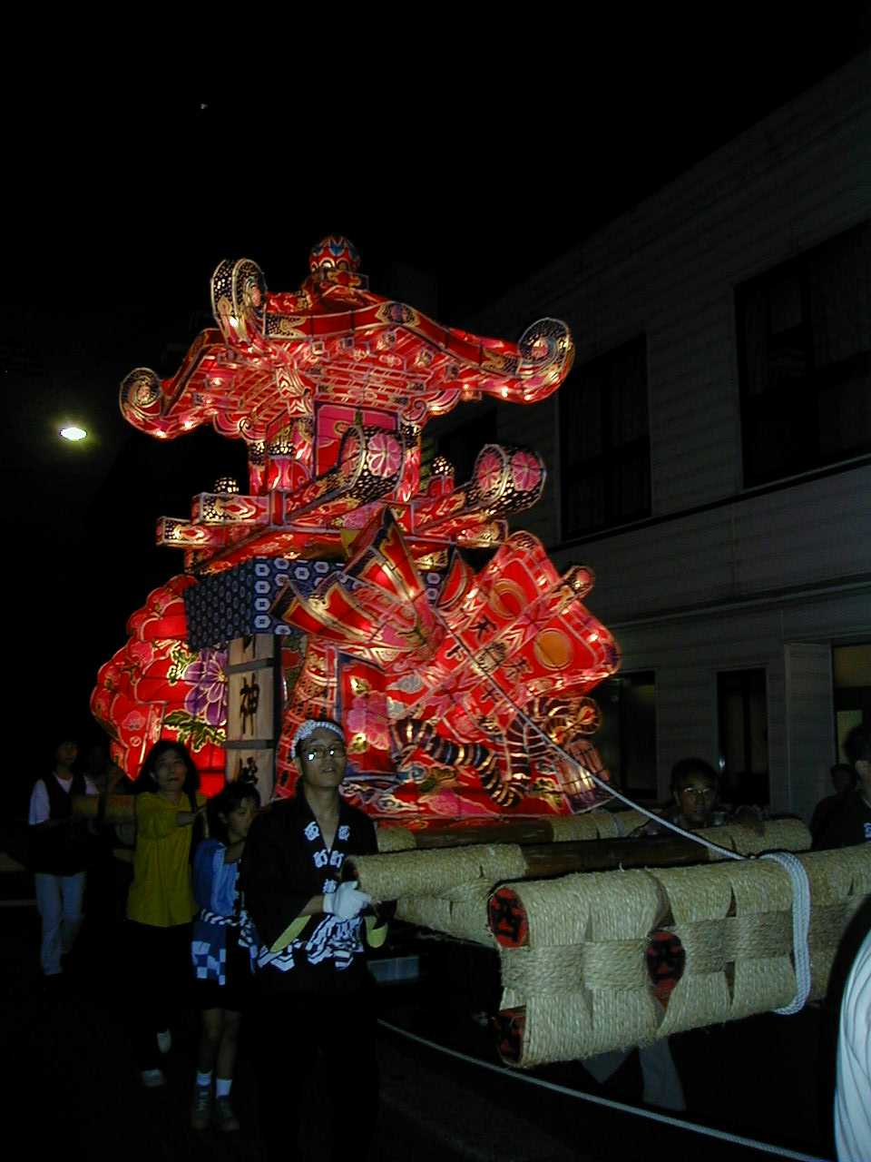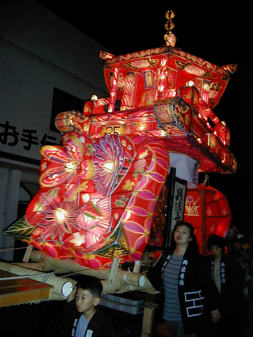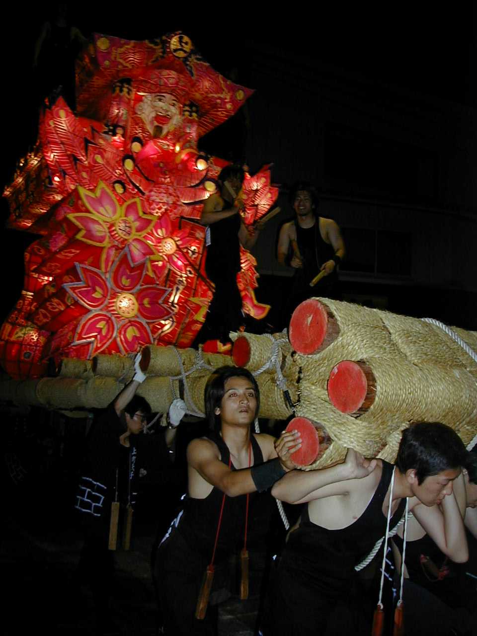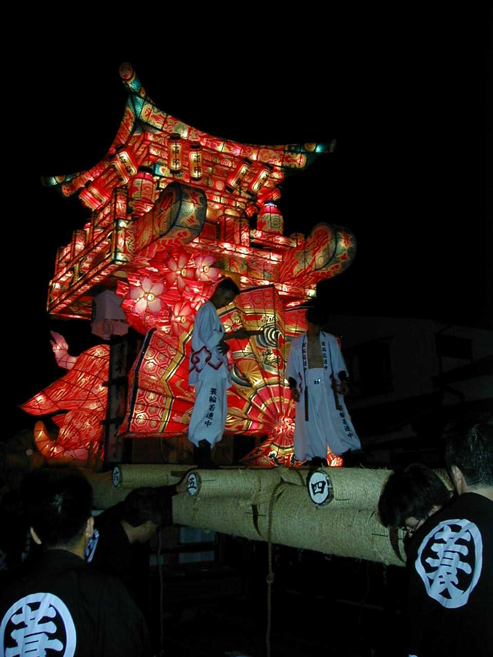 「」 怒号とどよめきの中、真剣な若衆の顔が行燈の灯かりに映し出される。祭りはこの瞬間、観衆も巻き込んで陶酔の頂点に達した。